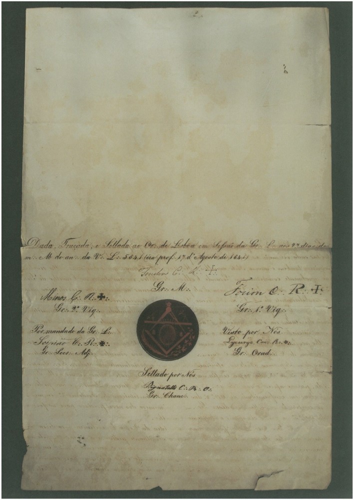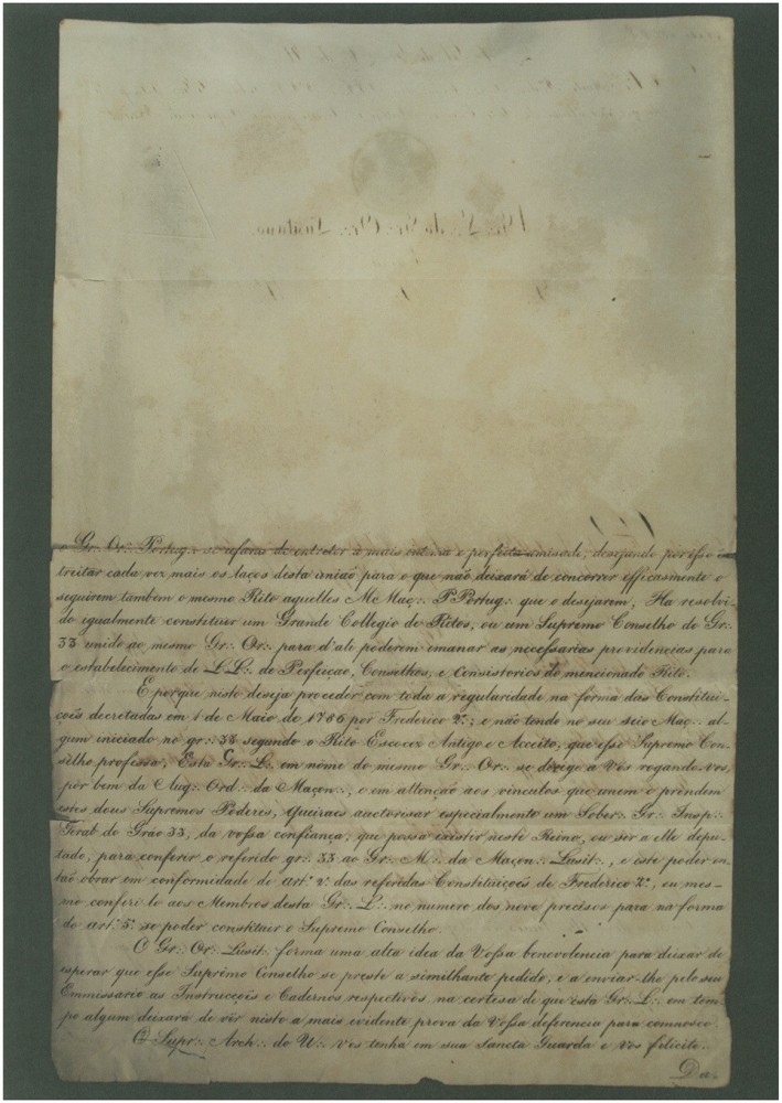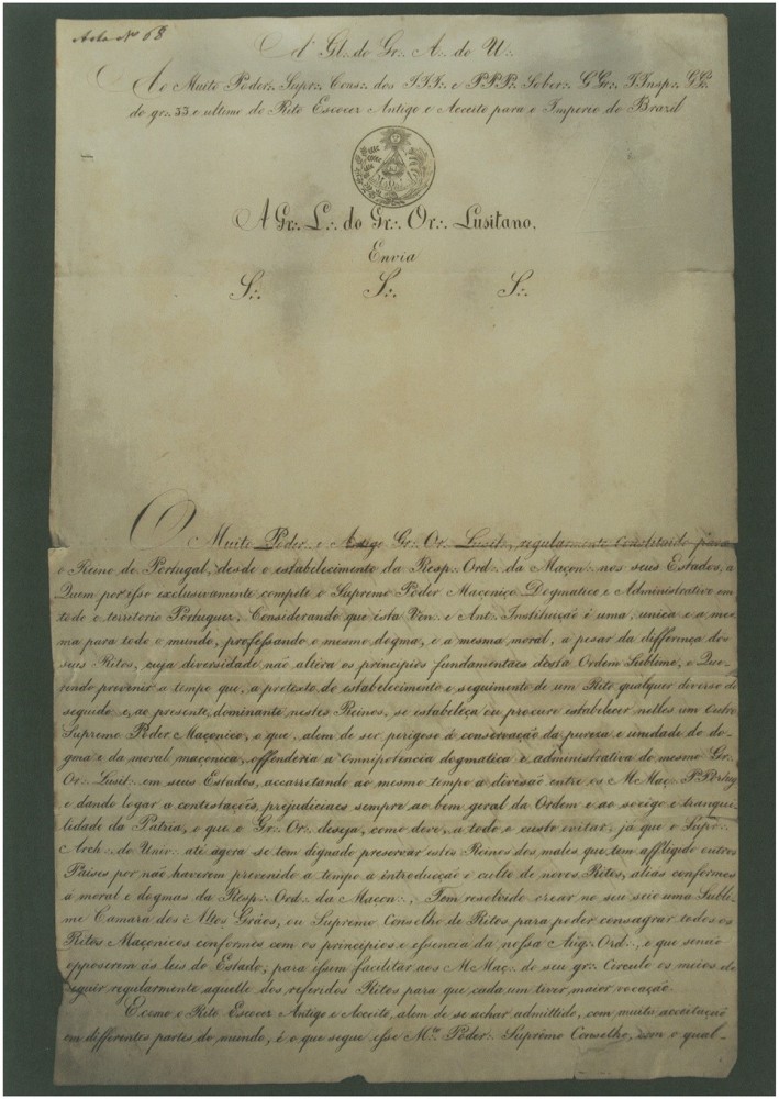 [5] - A informação pode ler-se em “The Freemason”, Vol. 2, nº 20, July 24, 1869, pág. 5: “In August, 1840, the Grand Orient sent to Rio de Janeiro and requested that permission be given them by the Supreme Council of Brazil to constitute a Supreme Council of the Ancient Accepted Rite for Portugal, the request was duly granted by letter patent from the Supreme Council, Grand Orient of Brazil, Valley of Lavradio, dated the 1st day of Kislev, 5840, creating Antonio Bernardo da Costa Cabral a 33°, with the power and authority to establish a Supreme Council of Ancient Accepted Rite, according to the Constitutions of 1786, which was duly constituted in 1842 , and recognized by the Supreme Council of Brazil , on the 14th day of April, 1843, V. E. and appointed a Grand Rep. of amity near that Supreme Body, on the 23rd July, 1843. The Grand Orient Lusitano sent a circular to all the Lodges, informing them of their recognition as a Supreme Council, 33d and last degree, Ancient Accepted Rite.”,